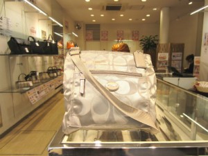 コーチ定番シグネチャー柄のショルダーバッグが入荷しました!殆ど使用感なくキレイな状態で、ラメがかったグレーがオシャレですね。